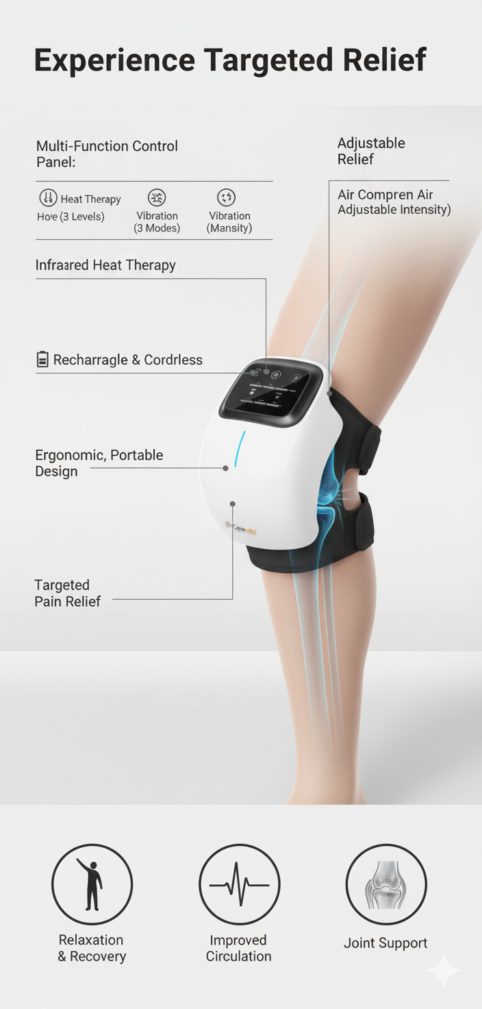 Masajeador de rodillas inalámbrico Careella con calor, vibración, correas ajustables, diseño inalámbrico y luz suave. Almohadilla térmica para rigidez en articulaciones, músculos y rodillas. Dispositivo de masaje portátil.